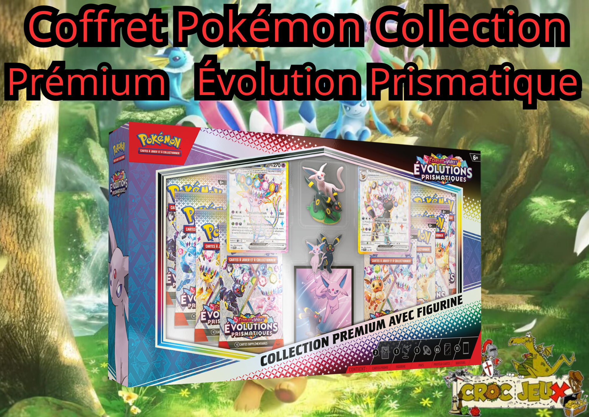 1 carte promo texturée brillante de Mentali-ex, 1 carte promo texturée brillante de Noctali-ex, 1 figurine représentant Mentali et Noctali, 1 pin’s de Mentali et Noctali, 65 protège-cartes représentant Mentali et Noctali, 11 boosters Écarlate et Violet – Évolutions Prismatiques du JCC Pokémon, 1 carte à code pour le JCC Pokémon Live